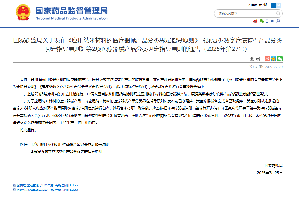 為進(jìn)一步加強(qiáng)應(yīng)用納米材料的醫(yī)療器械產(chǎn)品、康復(fù)類數(shù)字療法軟件產(chǎn)品的監(jiān)督管理,推動(dòng)產(chǎn)業(yè)高質(zhì)量發(fā)展,國家藥監(jiān)局組織制定了《應(yīng)用納米材料的醫(yī)療器械產(chǎn)品分類界定指導(dǎo)原則》《康復(fù)類數(shù)字療法軟件產(chǎn)品分類界定指導(dǎo)原則》(以下簡稱指導(dǎo)原則),現(xiàn)予以發(fā)布并將有關(guān)事項(xiàng)通告如下:一、···