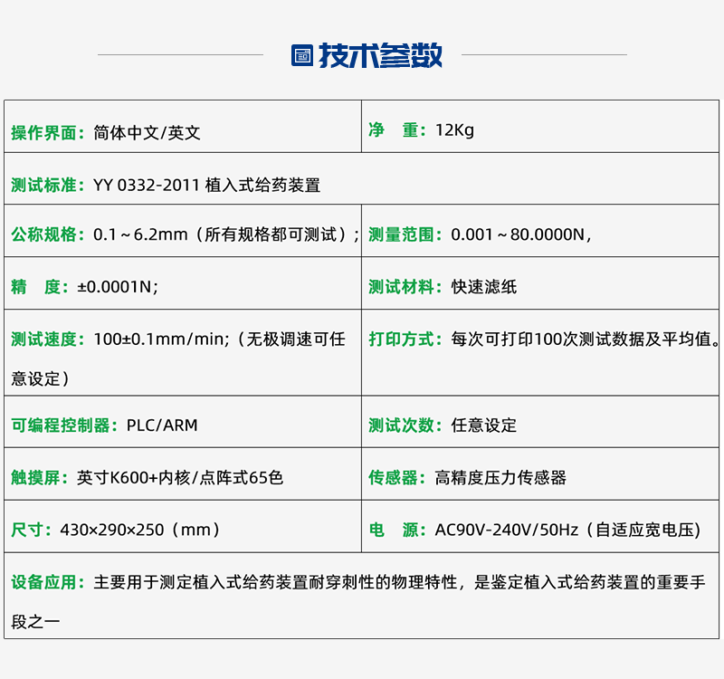 NCC0332-C給藥裝置耐穿刺性測(cè)試儀是國(guó)家檢驗(yàn)生產(chǎn)廠家產(chǎn)品性能的高效檢測(cè)設(shè)備,符合YY 0332-2011 植入式給藥裝置標(biāo)準(zhǔn)。實(shí)時(shí)顯示穿刺力曲線測(cè)試結(jié)果及最大刺穿力數(shù)據(jù)??涩F(xiàn)實(shí)F0到F5峰值數(shù)據(jù)。針對(duì)測(cè)試結(jié)果自動(dòng)判斷,不合格啟動(dòng)自動(dòng)報(bào)警,并由打印機(jī)打印出測(cè)試數(shù)據(jù)及結(jié)果以供分析。是國(guó)家檢驗(yàn)生產(chǎn)廠家產(chǎn)品能力的有效檢測(cè)手段。