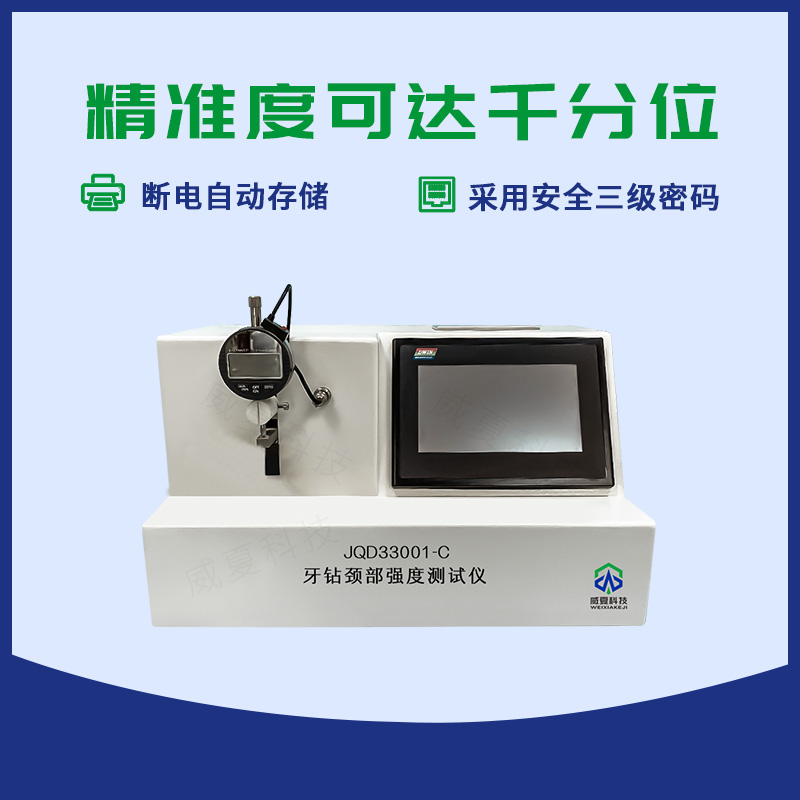 威夏科技 ZBC33001-JQD1 牙鉆頸部強(qiáng)度試驗(yàn)儀是國(guó)家檢驗(yàn)生產(chǎn)廠家產(chǎn)品性能的高效檢測(cè)設(shè)備。設(shè)備應(yīng)用:ZBC33001-JQD1 牙鉆頸部強(qiáng)度試驗(yàn)儀主要用于測(cè)定醫(yī)用牙鉆的強(qiáng)度的物理特性,是鑒定醫(yī)用牙鉆的重要手段之一。測(cè)試操控范圍包括:測(cè)試項(xiàng)目、牙鉆形式、牙鉆頭部形狀、牙鉆直徑、打印設(shè)定、測(cè)試、上行、下行、時(shí)間、標(biāo)定,檢定等功能設(shè)定。
