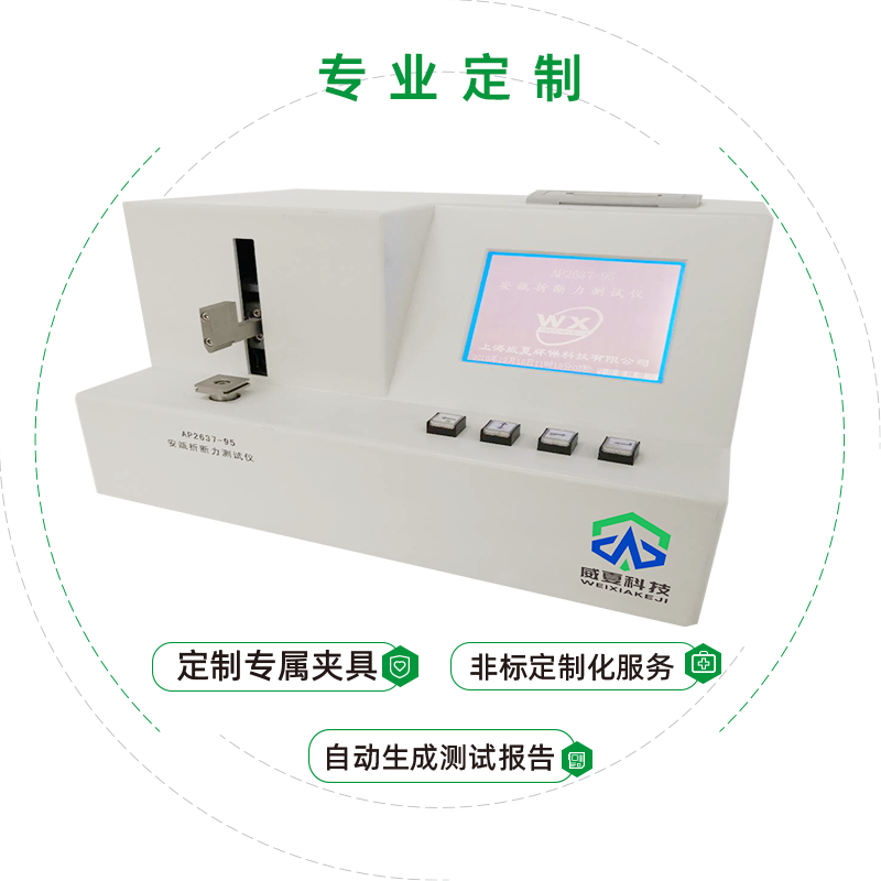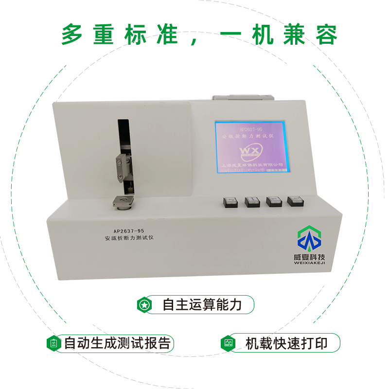 威夏科技 AP2637-95 安瓿折斷力測(cè)試儀是國(guó)家檢驗(yàn)生產(chǎn)廠家產(chǎn)品性能的高效檢測(cè)設(shè)備。設(shè)備應(yīng)用:安瓿折斷力測(cè)試儀主要用于測(cè)定安瓿瓶折斷力的物理特性,是鑒定安瓿瓶的重要手段之一。菜單選擇規(guī)格、標(biāo)準(zhǔn)支架、上行、下行、時(shí)間、標(biāo)定、測(cè)試次數(shù)、實(shí)時(shí)顯示折斷力及折斷力曲線,并可有機(jī)載打印機(jī)打印。