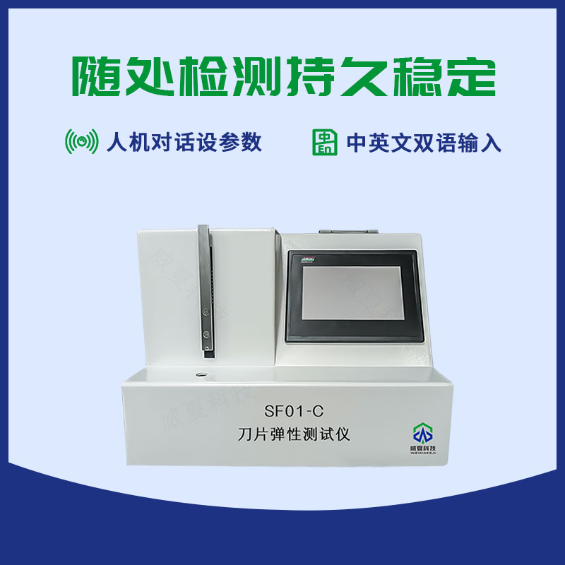 威夏科技SF01-C刀片彈性測試儀是國家檢驗生產(chǎn)廠家產(chǎn)品性能的高效檢測設備。刀片彈性測試儀主要用于測定醫(yī)用刀片彈性的物理特性,是鑒定醫(yī)用手術刀片的重要手段之一。由可編程控制器、液晶顯示屏、步進電機控制的傳動機構、百分表顯示的實測距離打印機等組成,可設定規(guī)格,下行距離。在屏上顯示下行距離,試驗時間,變形量,并可由打印機打印出試驗數(shù)據(jù)。