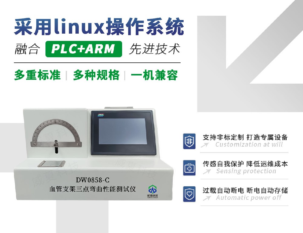DW0858-C血管支架三點彎曲性能測試儀血管支架三點彎曲性能測試用于評估支架在彎曲載荷作用下的柔韌性、結(jié)構(gòu)穩(wěn)定性及抗變形能力,是驗證支架順應(yīng)性和植入安全性的重要指標(biāo)。檢驗血管支架三點彎曲性能推薦威夏科技自主研發(fā)的DW0858-C血管支架三點彎曲性能測試儀。血···